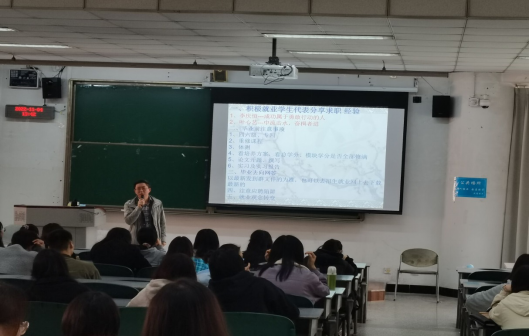 两位已就业的学生代表分享求职经验。李庆恒同学以“成功属于勇敢行动的人”为主题,向参会人员分享了他的求职经历。他投了近50份简历,只收到4份回复,经过锲而不舍的努力,成功被深南电路股份有限公司录用。他建议同学们勇敢尝试,迈出找工作的第一步,坚定理想,自信从容,争取早日找到一份心仪的好工作。叶心艺同学的求职分享主题是“中流击水,奋楫者进”,她建议同学们重视简历制作,提早行动,抓住机会。两位同学一致认为成功是留给有准备的人的。