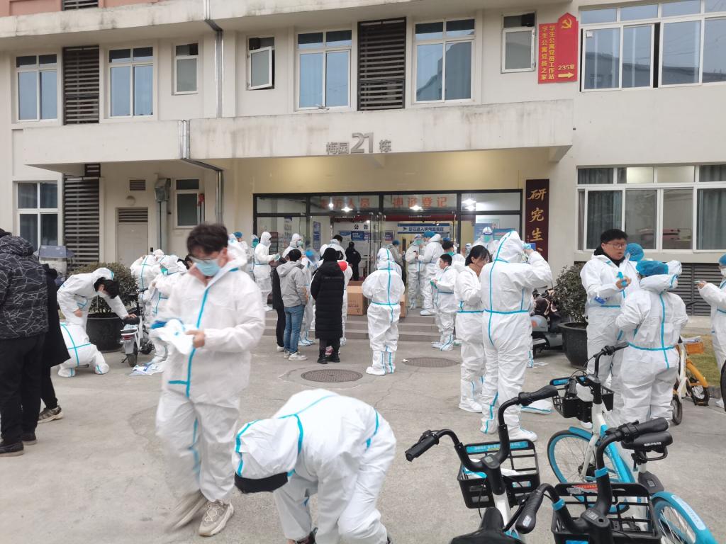 12月1号晚,学校发现核酸检测混管阳性情况。外国语学院党委书记杨昊、分团委书记达苗第一时间前往现场,在校陪伴同学们,同医护人员和志愿者一起组织核酸单采。学校发现新冠感染者后,立即部署相应防控方案,为管控寝室配送盒饭。