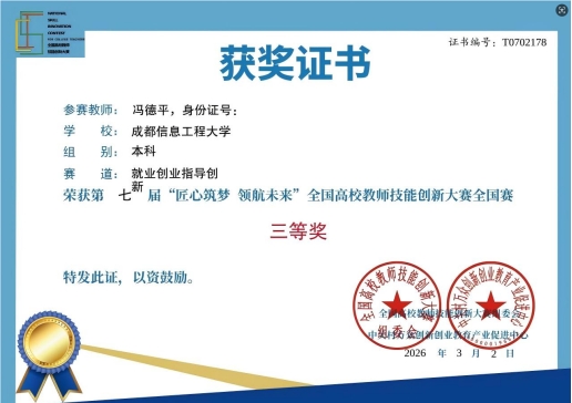 2026年3月,第七届“匠心筑梦 领航未来”全国高校教师技能创新大赛评审结果正式揭晓,外国语学院教师再创佳绩。在全国904所高校4014位选手中,外国语学院教师宋洁琳、冯德平分获教学工作创新赛道全国二等奖,就业创业指导创新赛道全国三等奖。