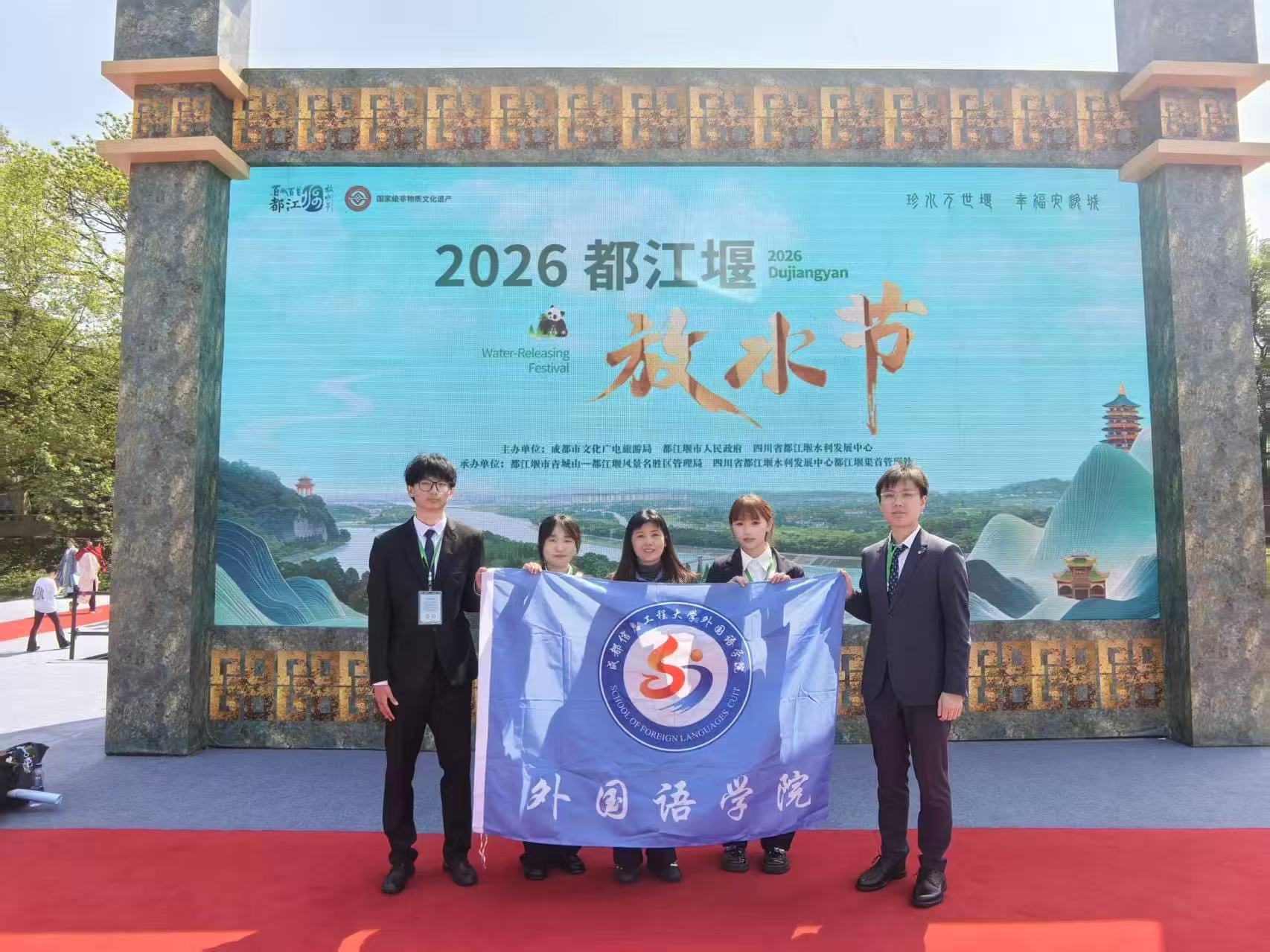 4月2日至4日,外国语学院院长黄驰、教师胥婷带领学院学生志愿者团队(董纹吉、蔡锦山、黄媛、谢梓骏),赴都江堰市参与多国使领团都江堰行暨“2026国际放水节”活动,协助都江堰市外事办开展多项外事服务工作。